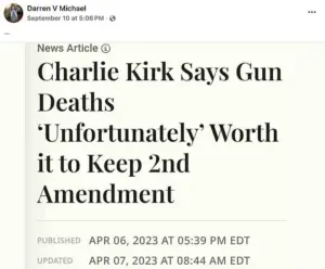 The article’s headline—’Charlie Kirk Says Gun Deaths ‘Unfortunately’ Worth It to Keep 2nd Amendment’—was interpreted by some as suggesting Kirk had expressed a controversial view about the value of gun violence in preserving Second Amendment rights.