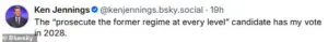 Jennings’ message was clear: he would vote for any candidate who promises to prosecute the Trump administration following the incident. ‘The “prosecute the former regime at every level” candidate has my vote in 2028,’ he wrote, hours after President Trump defended the use of lethal force by ICE agents.