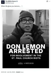 The White House’s social media post, captioning a black-and-white image of Lemon inside the Minnesota church with the phrase ‘When life gives you lemons…’ was interpreted by some as a veiled jab at Lemon’s journalistic career, while others saw it as a broader commentary on the administration’s stance on protest and free speech.